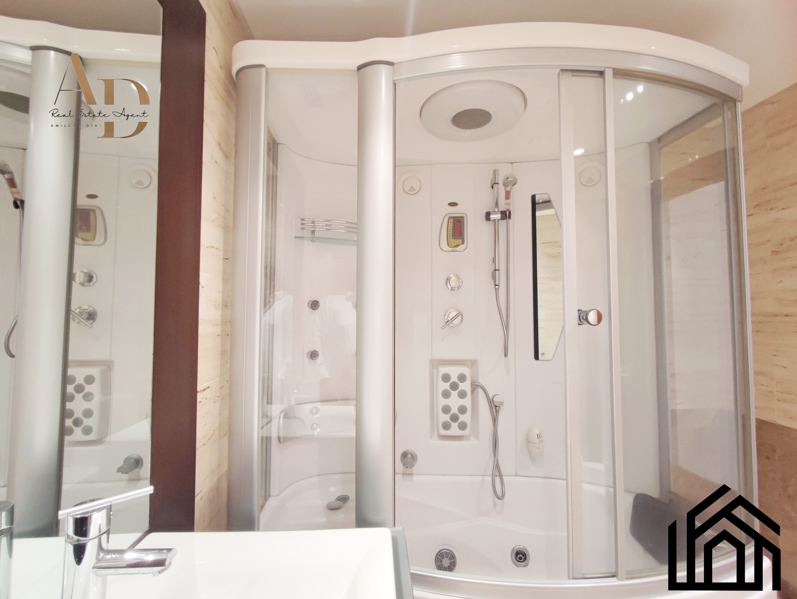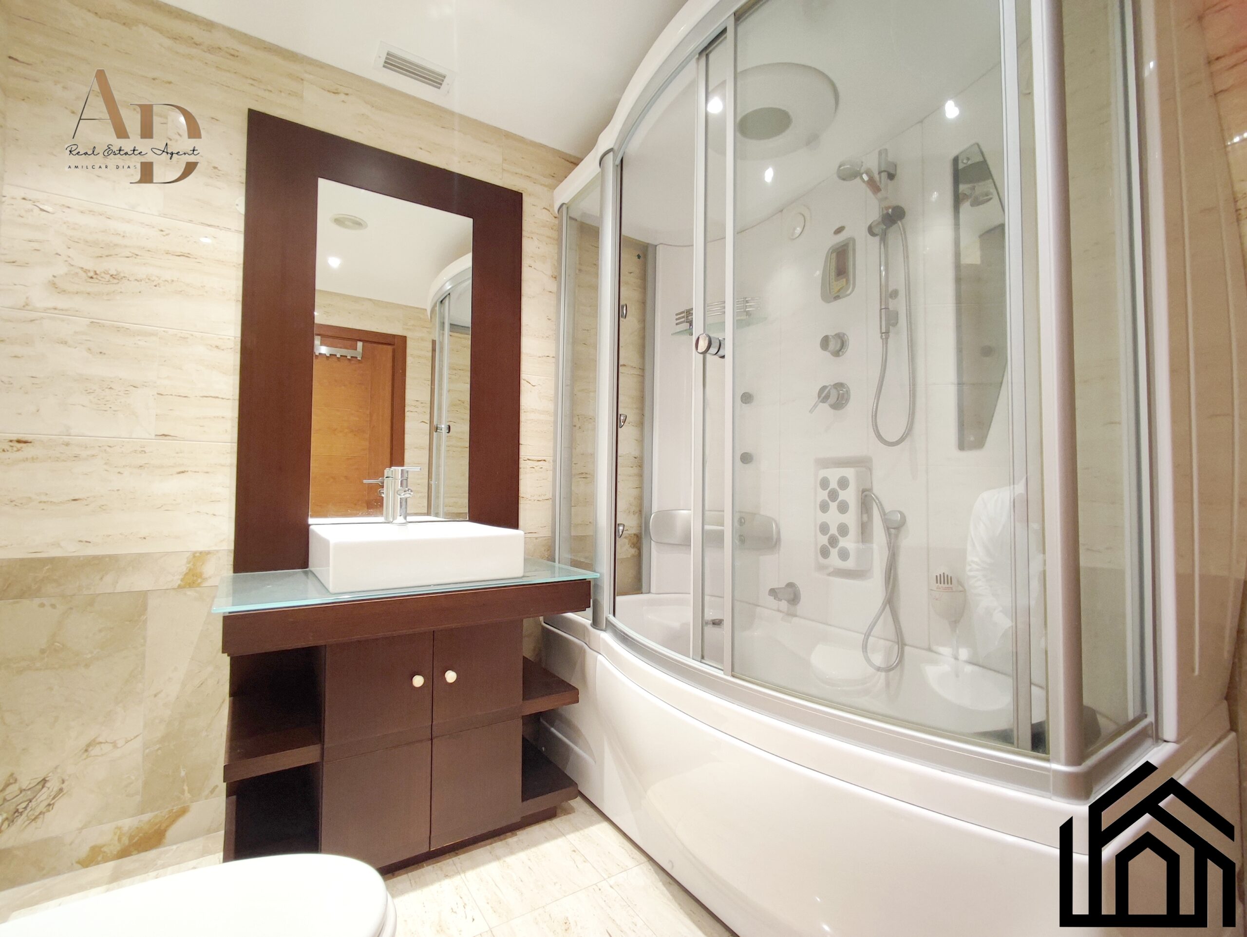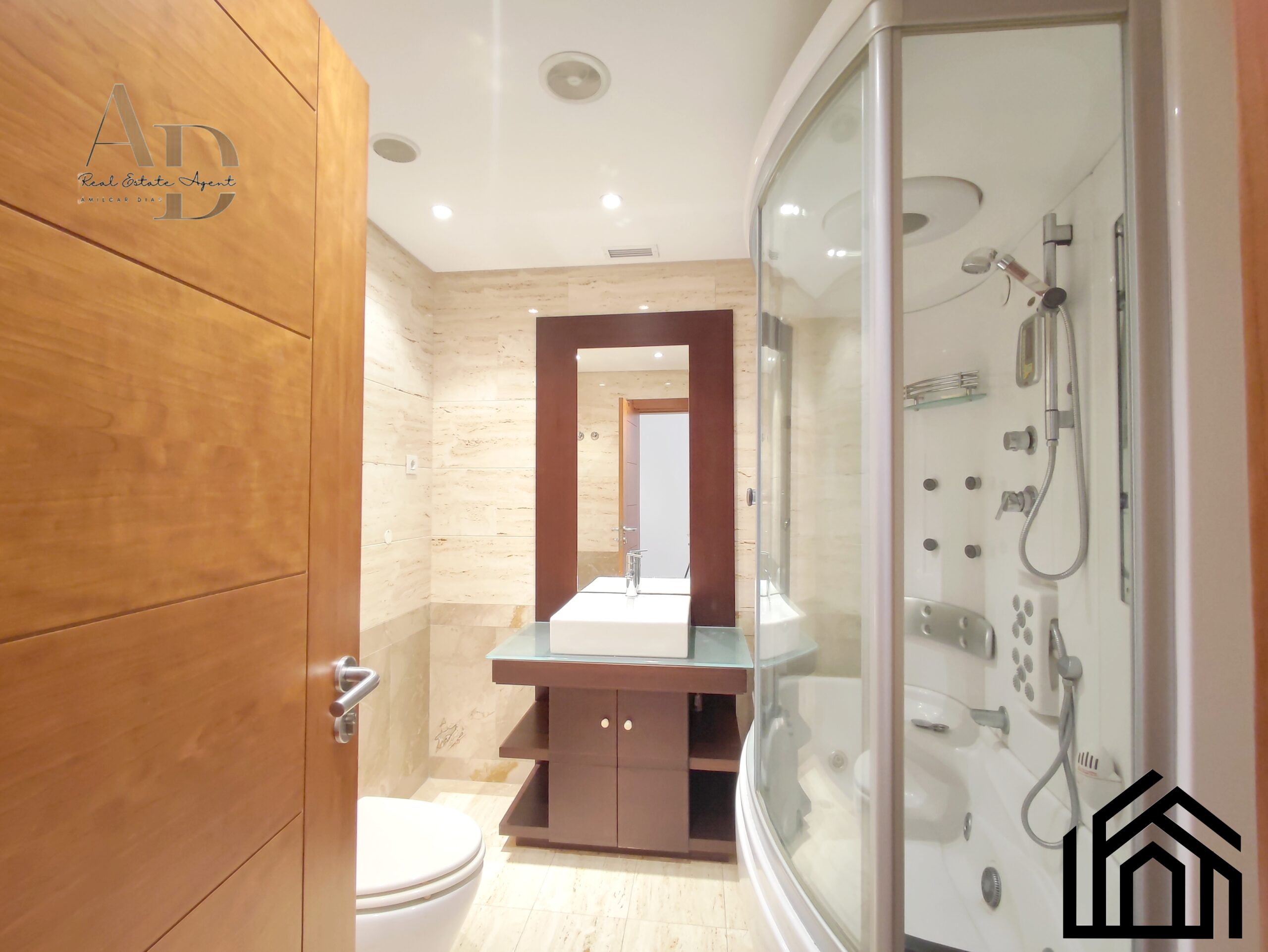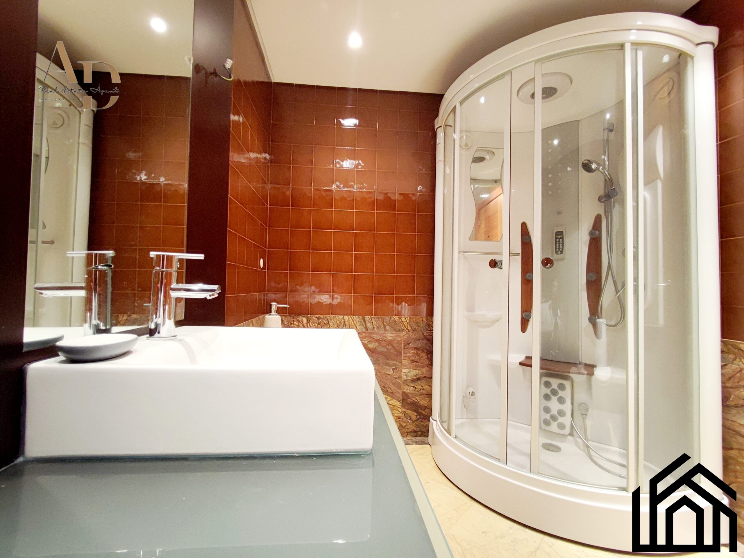 •A casa de banho de apoio aos quartos conta com cabine de hidromassagem, loiças sanitárias suspensas e um móvel de lavatório com bastante arrumação.