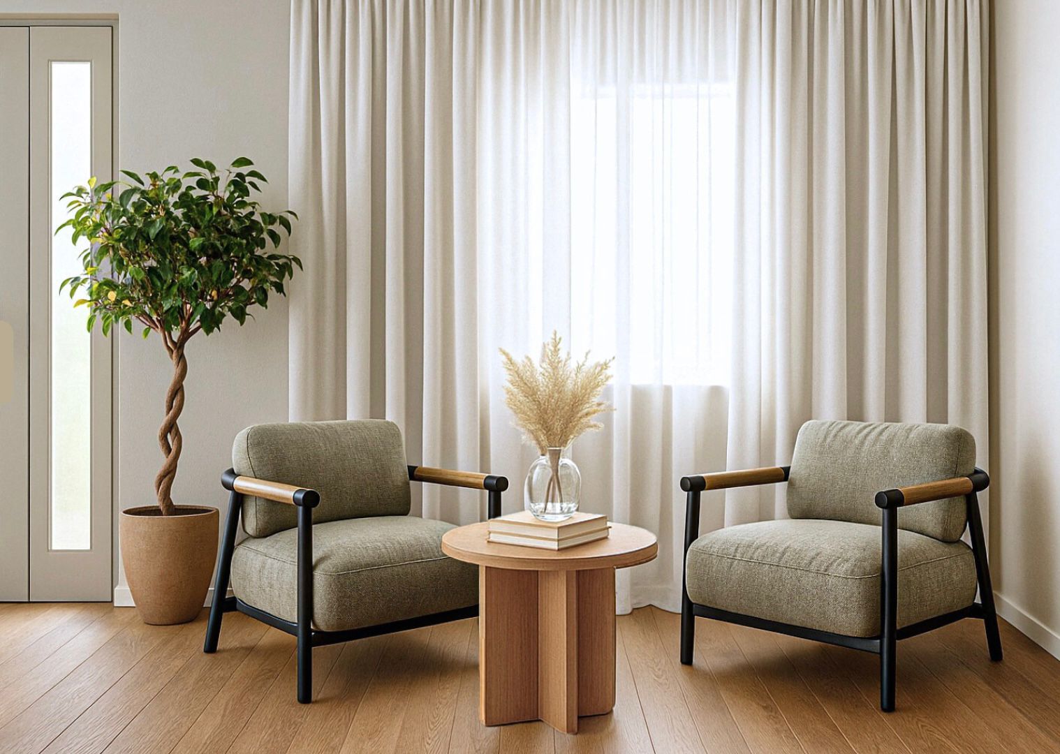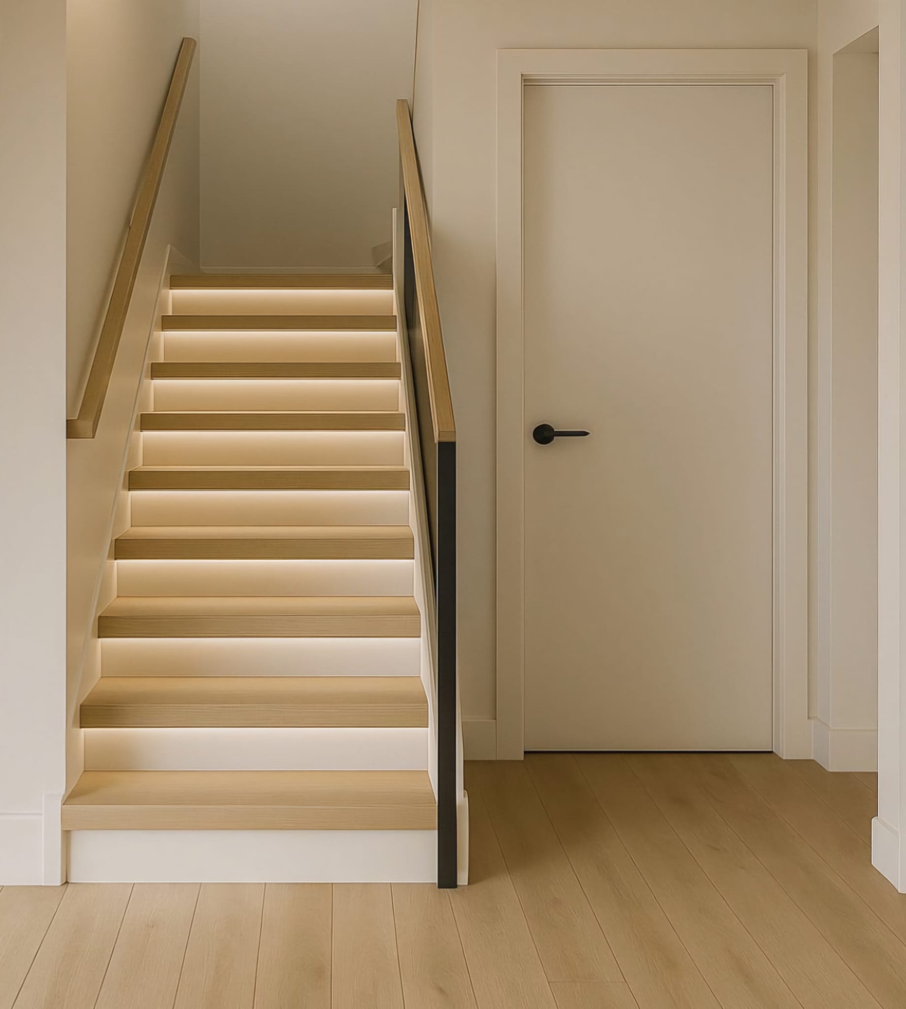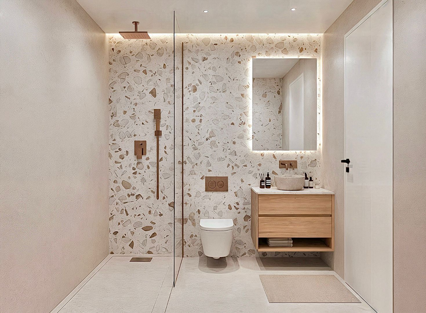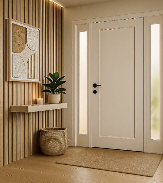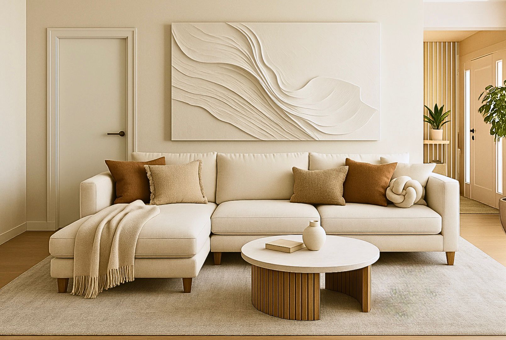 A entrada faz-se por um elegante hall, que dá acesso a uma ampla sala de estar com lareira, móvel de TV integrado e sofisticados revestimentos em cerâmica e carvalho.