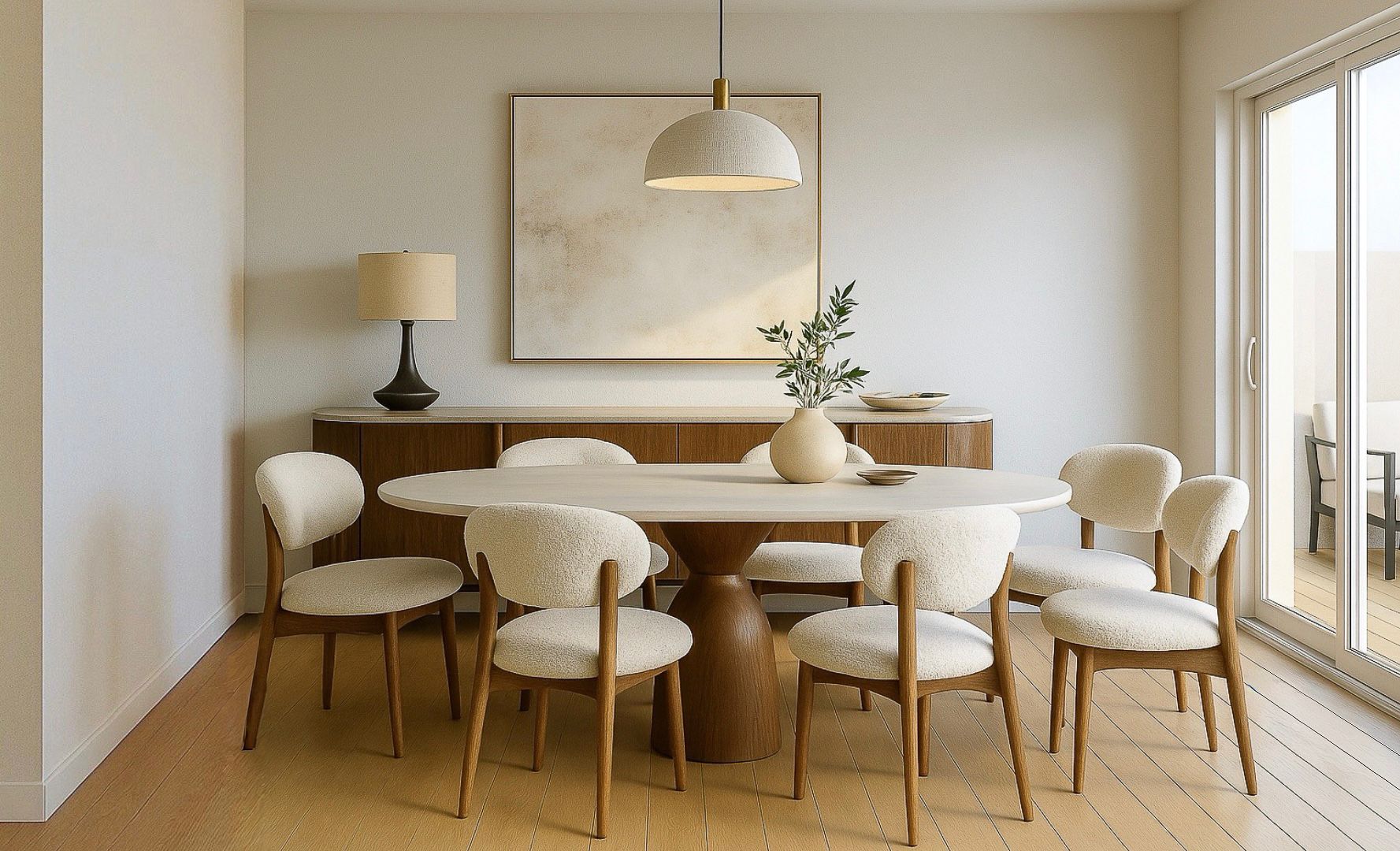 A sala de jantar em conceito open space liga-se a uma cozinha moderna totalmente equipada, criando um ambiente perfeito para convívio em família e com amigos.