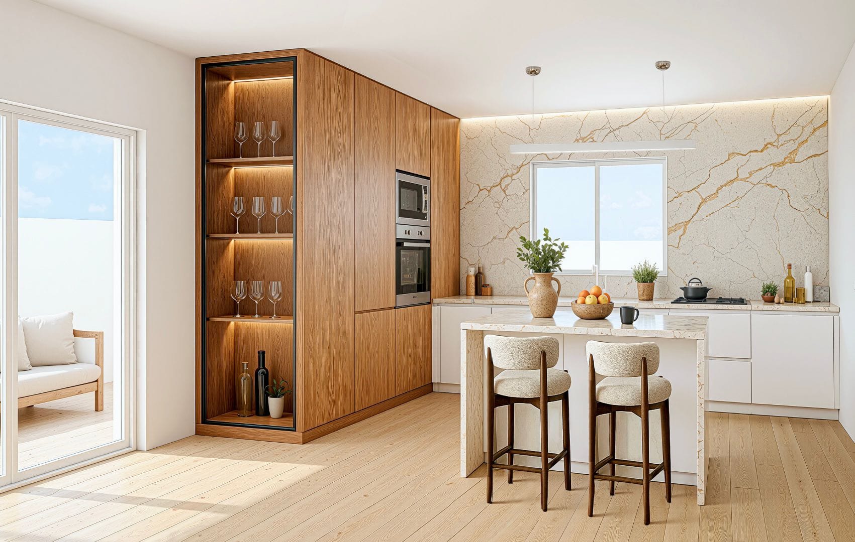 A cozinha destaca-se pelo design contemporâneo, com mobiliário em carvalho e lacado branco, ilha central, bancadas e revestimentos em Silestone Quartz Carrara, e eletrodomésticos BOSCH.